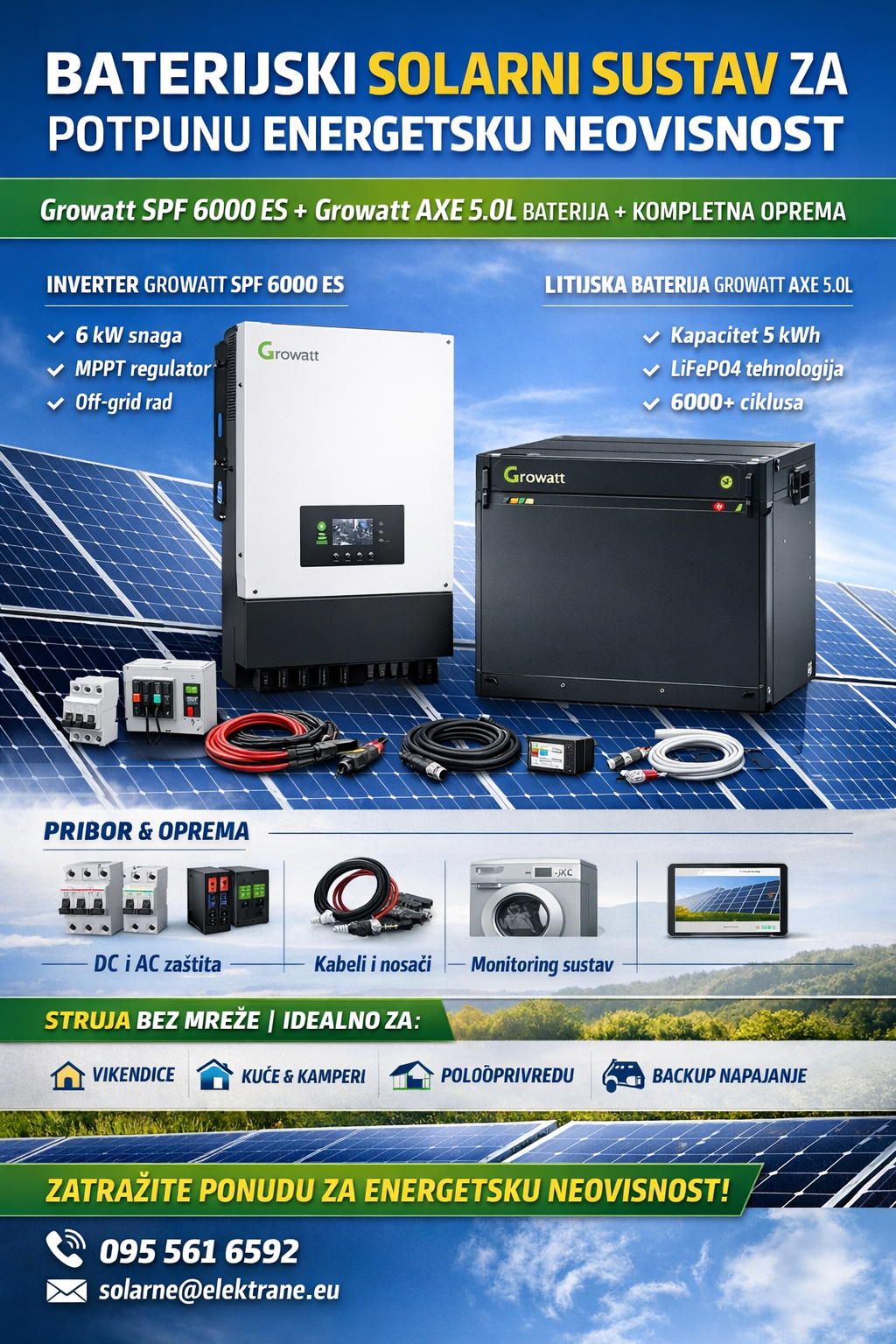 Baterije za pohranu: Ako želite pohraniti višak energije za korištenje u noćnim satima ili oblačnim danima, potrebne su vam baterije. One omogućuju veću autonomiju i neovisnost o vanjskim izvorima energije.
